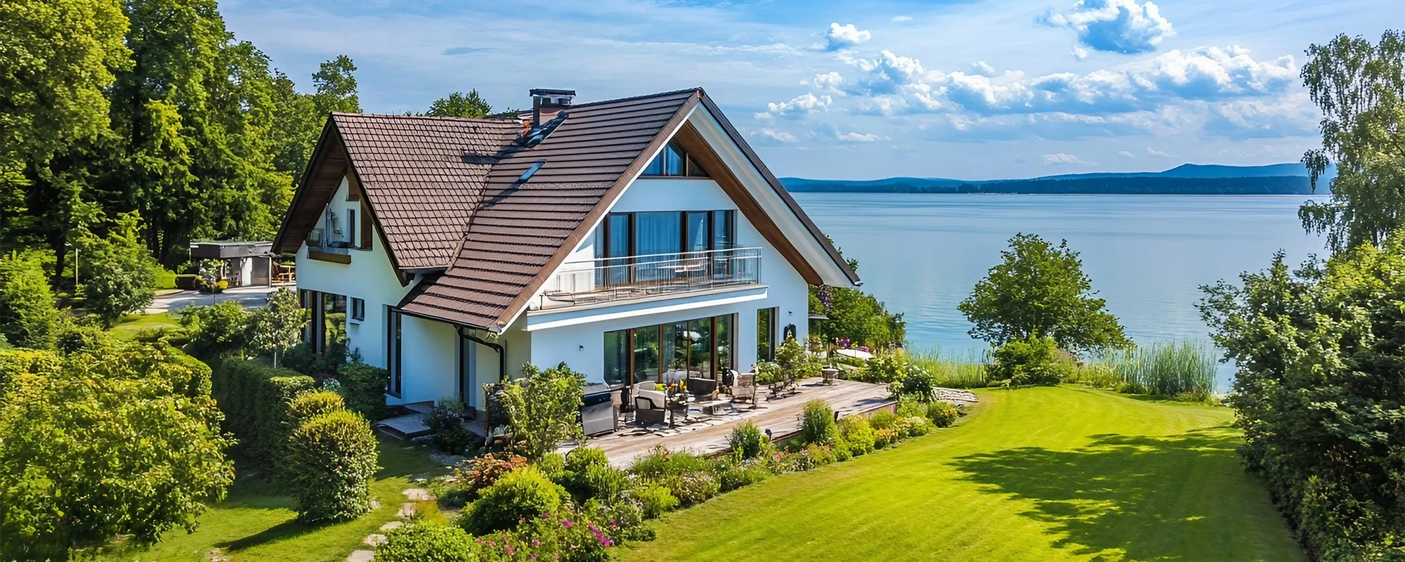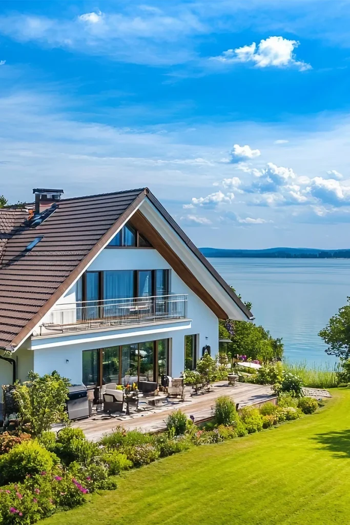 Das Bild zeigt ein modernes Haus direkt am Seeufer. Es hat große Fensterfronten und eine Terrasse, umgeben von einem gepflegten Garten. Im Hintergrund ist ein weiter See sichtbar. Ideal für ein Hauskauf am Ammersee, Starnberger See oder Wörthsee.