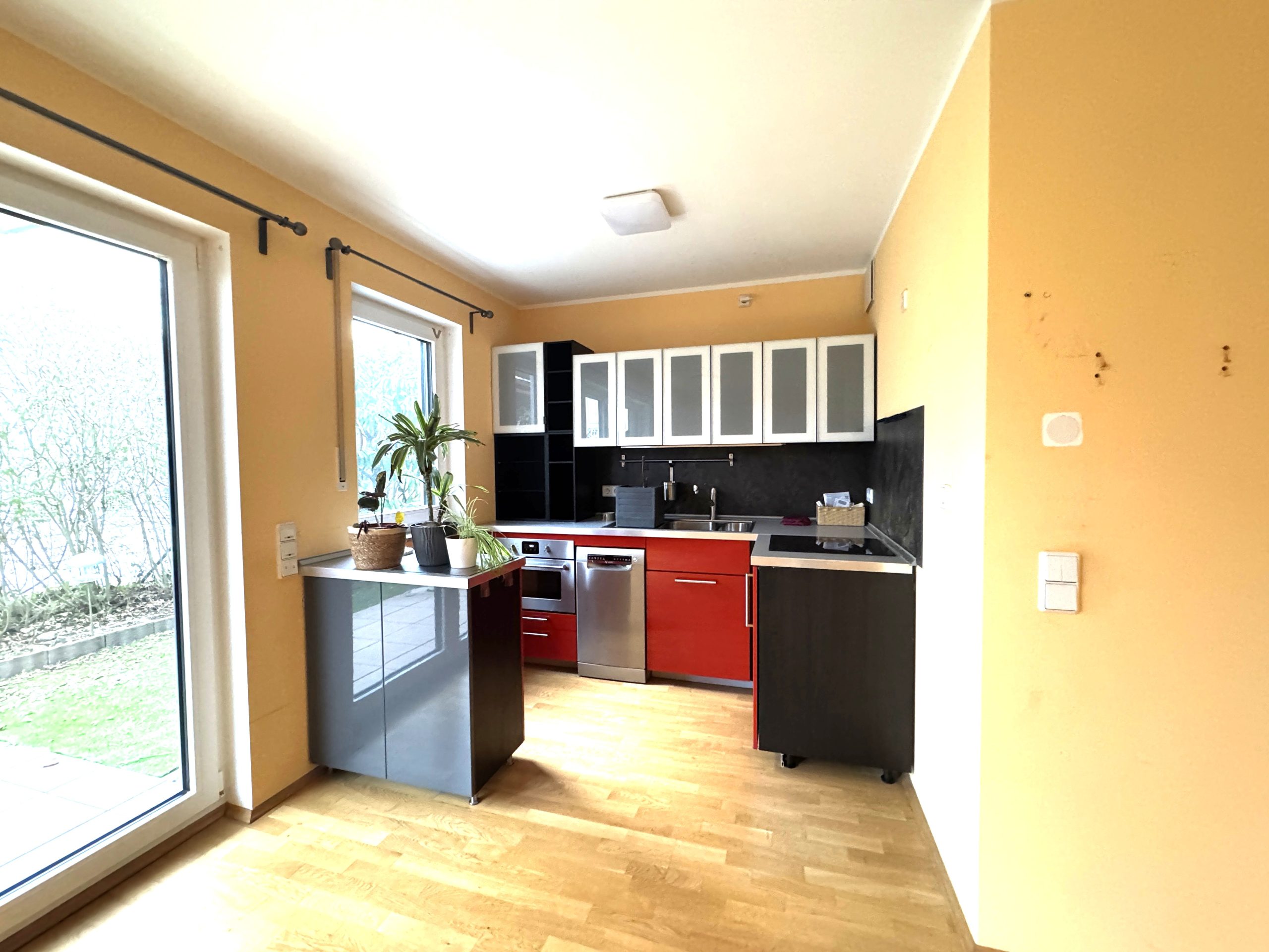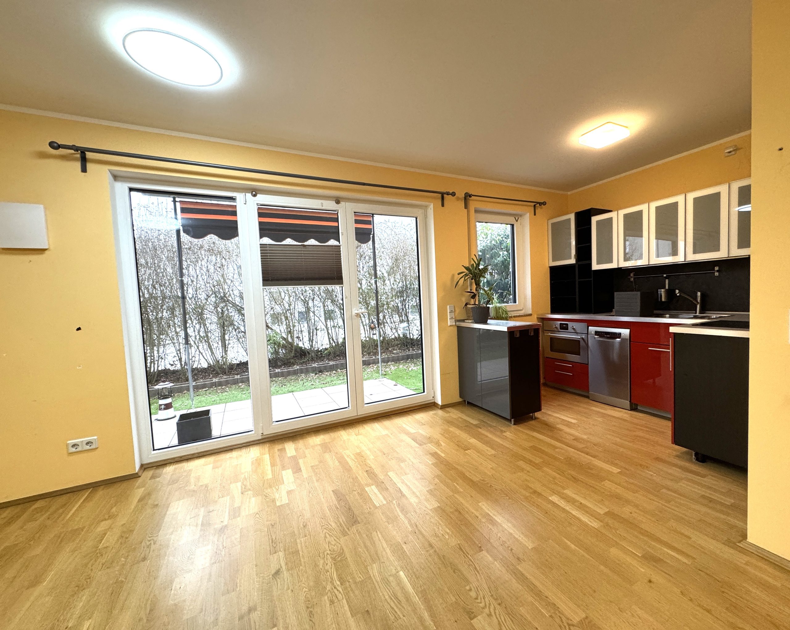 Fenstern zur Terrasse schafft eine helle und freundliche Atmosphäre. Von hier aus gelangen Sie auf die eingewachsene Terrasse, die in den warmen Monaten zusätzlichen Wohnkomfort bietet. Die vorhandene Einbauküche ist integriert im offenen Wohn- Essbereich.