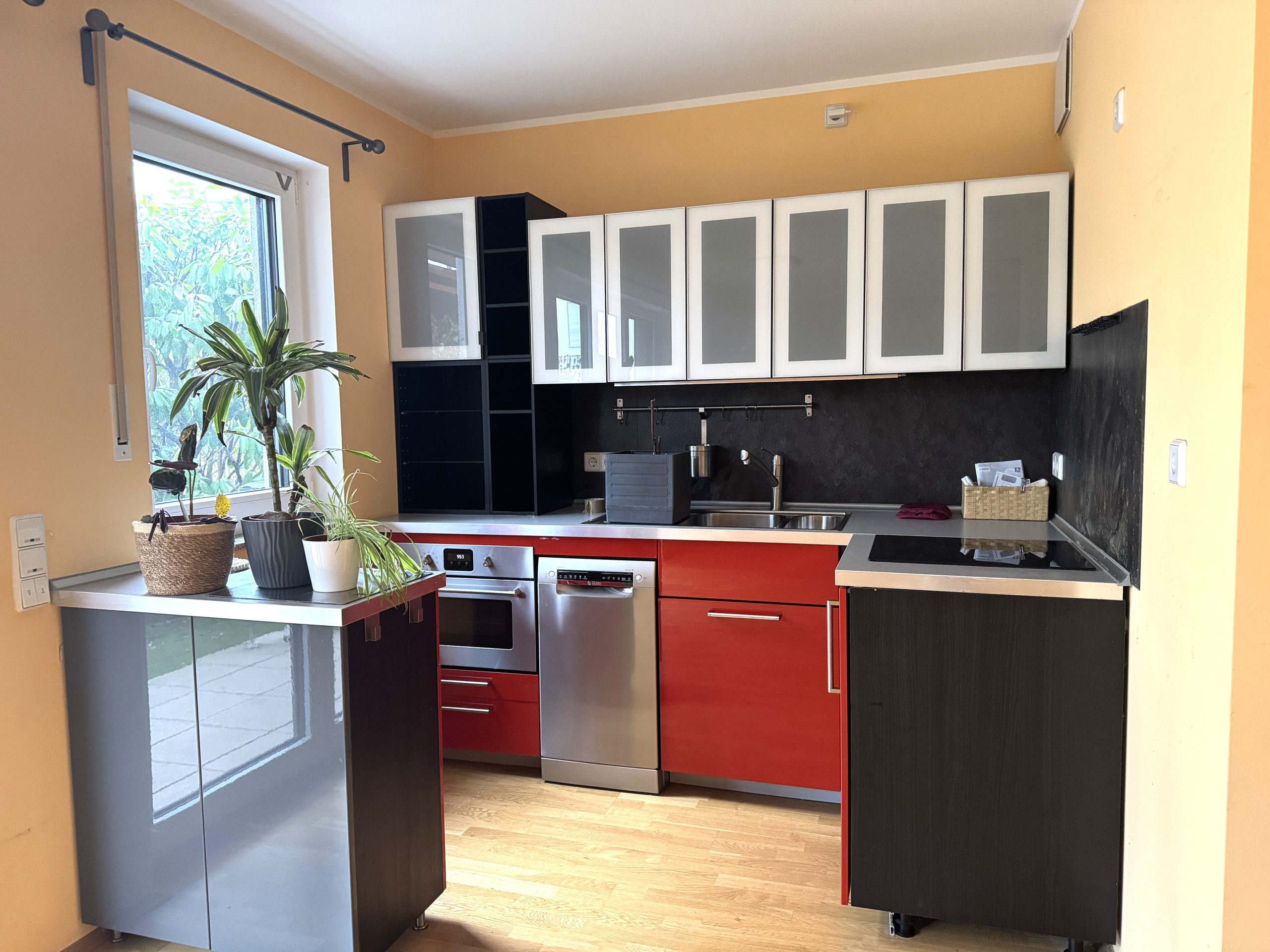 - Ikea Küche vorhanden mit kleiner Bosch Spülmaschine, Backofen und 3 Platten Ceran-Kochfeld